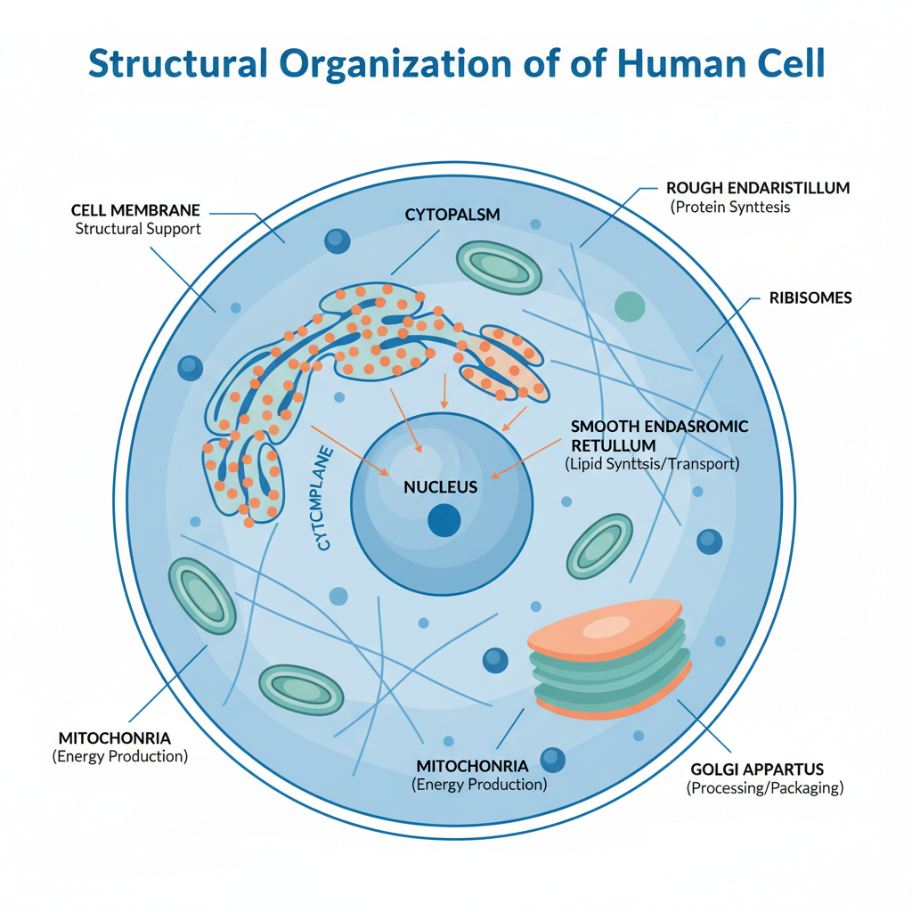 A typical human cell contains specialized structures that support essential biological functions. The cell membrane regulates exchange with the environment, the nucleus stores genetic information, mitochondria generate energy, and intracellular organelles coordinate protein synthesis, transport, and cellular organization. Together, these components enable cells to maintain homeostasis and respond to internal and external signals.