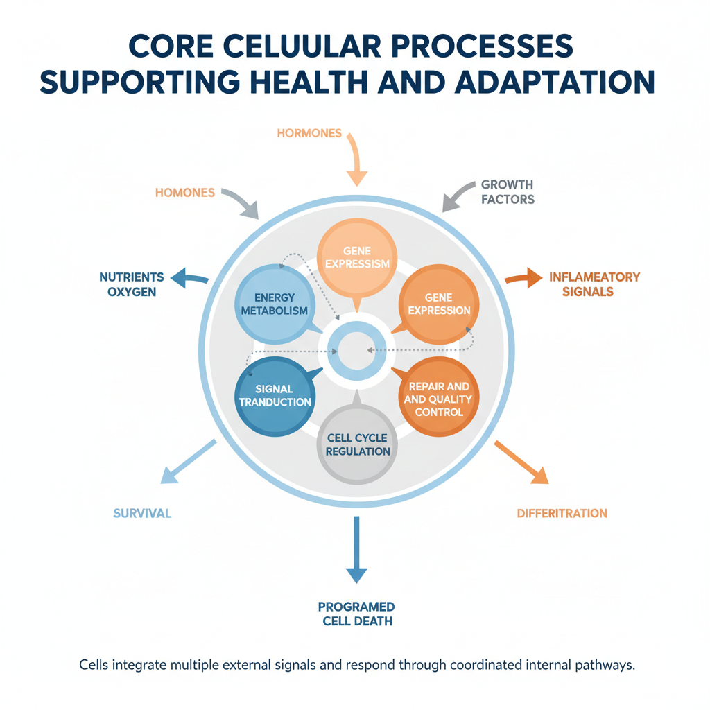 Figure 2. Core cellular processes supporting health and adaptation. Cells integrate extracellular signals, including nutrients, oxygen, hormones, growth factors, and inflammatory mediators, through interconnected intracellular pathways. These inputs regulate fundamental processes such as signal transduction, energy metabolism, gene expression, cell cycle control, and cellular repair and quality control, which together determine cellular fate and adaptive responses, including survival, differentiation, and programmed cell death.