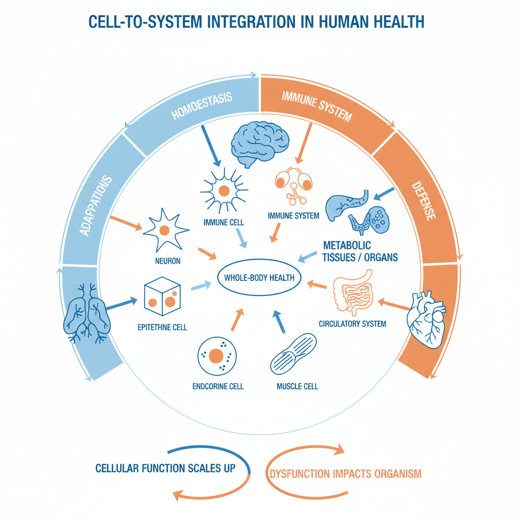 Figure 3. Cell-to-system integration in human health. This schematic depicts the multiscale organization of human physiology, showing how cellular functions are integrated into tissue, organ, and whole-body systems. Specialized cell types, including neurons, epithelial cells, immune cells, endocrine cells, and muscle cells, interact with higher-order physiological systems such as the immune system, metabolic tissues and organs, and the circulatory system. These interconnected networks collectively support essential organismal functions, including homeostasis, adaptation, and defense, thereby contributing to whole-body health. The diagram also emphasizes that cellular function scales upward to influence systemic physiology, whereas cellular dysfunction can propagate across levels of biological organization and adversely affect the organism as a whole.